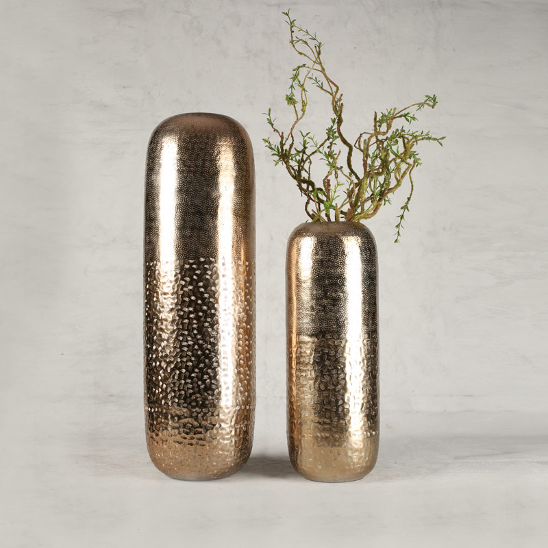 This bright gold vase with a multi-hammered texture is a unique find when it comes to aluminium vases. Its lean, tall shape makes it stand out in any corner and adds a splash of colour to your contemporary decor. Use this to showcase tall flowers and plants.