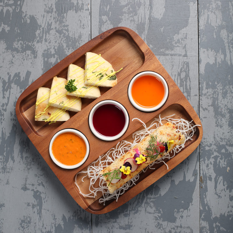 Dinex wooden Multipurpose Snacks Serving platter With 3 Dip Bowls